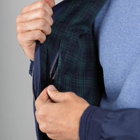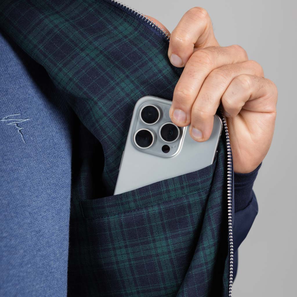 A luxury Harrington jacket with water-repellent fabric, tartan lining, and hidden pockets for all-weather elegance.