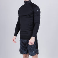 A compression mock-neck top with technical fabric for warmth, sweat-wicking, and freedom of movement in cold weather.